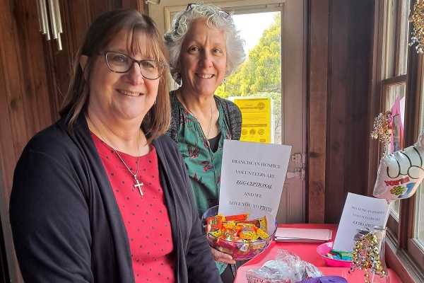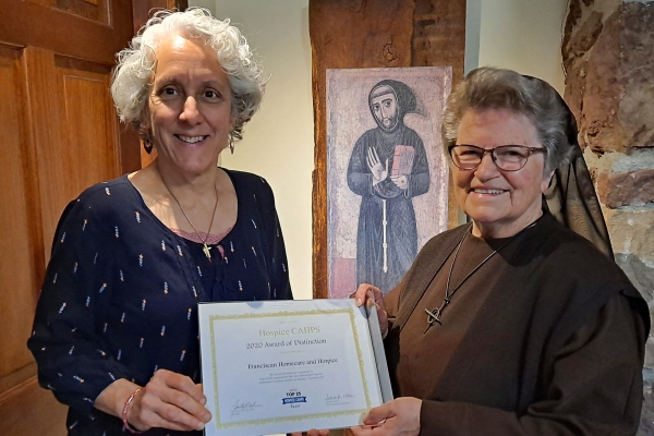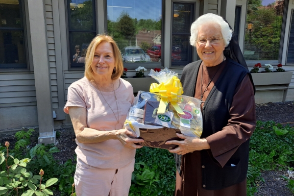 Lorraine Legnani, Payroll Director, accepts a gift basket from Sister Mary Richards, FSE, Finance Director, Franciscan Home Care and Hospice Care. Lorraine is celebrating both her birthday and 25 years of dedicated service to the agency.