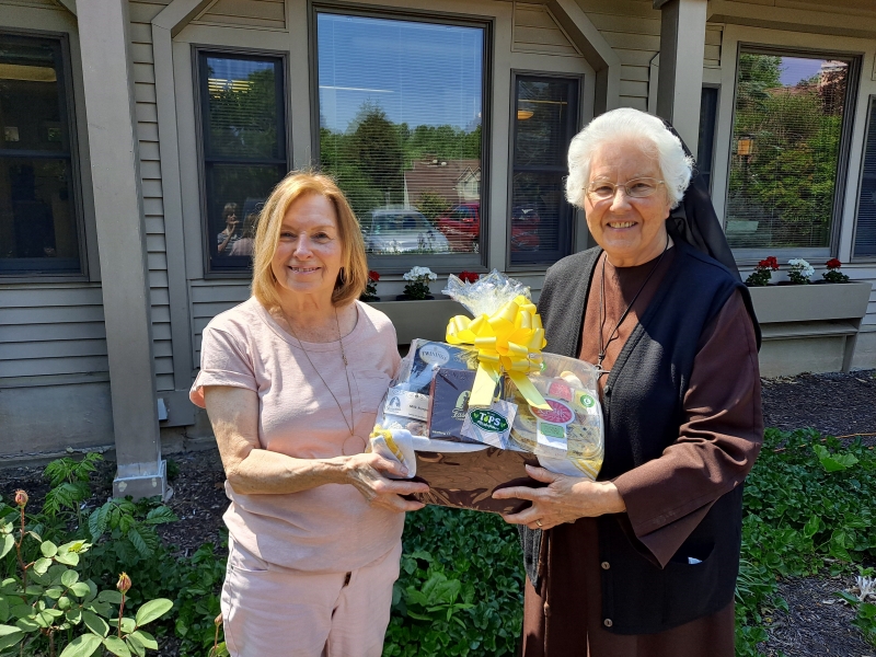 Lorraine Legnani, Payroll Director, accepts a gift basket from Sister Mary Richards, FSE, Finance Director, Franciscan Home Care and Hospice Care. Lorraine is celebrating both her birthday and 25 years of dedicated service to the agency.