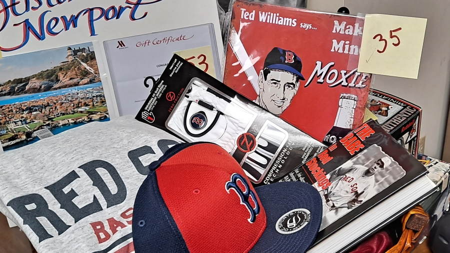 Sister Barbara Johnson, FSE, Executive Director, Franciscan Life Center, admires a few of the Silent Auction items for the 36th Franciscan Sports Banquet and Silent Auction on June 7, 2022, at the Aqua Turf Club. Other items include a two-night stay at the Marriott in Newport, jewelry and lots of sports memorabilia.