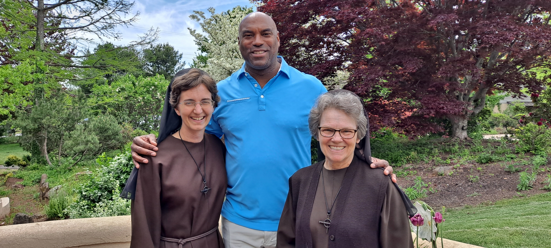Scott Burrell, Head Men’s Basketball Coach, Southern Connecticut State University, recently met with Sister John Frances Lafever, FSE, and Sister Barbara Johnson, FSE, Executive Director of the Franciscan Life Center. Coach Burrell is receiving the Saint Francis Award at the 36th Annual Franciscan Sports Banquet and Silent Auction, on June 7, 2022, at the Aqua Turf Club. This events benefits outpatient mental health and the home health care and hospice care services of Franciscan Home Care and Hospice Care.