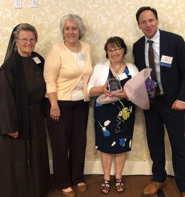 Franciscan Home Care and Hospice Care proudly congratulates Dora Aleman, Hospice Aide, for being chosen as the recipient of the inaugural Florence Wald Award for Excellence in End of Life Care from the Connecticut Association for Healthcare at Home at their annual Hospice and Palliative Care Summit. Dora was selected among the many entries for exemplifying the core values of care and concern in her work with hospice patients. Pictured above from left are Sister Suzanne Gross, FSE, Administrator, Franciscan Home Care and Hospice Care; Laura Borrelli, RN, Hospice Director; Dora Aleman, Hospice Aide; and Edo Banach, President and CEO, National Hospice and Palliative Care Organization.