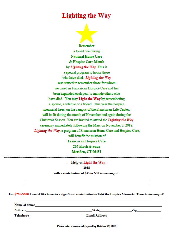 Your donation will help light the memorial trees on the Franciscan Home Care and Hospice Care campus during the month of November.