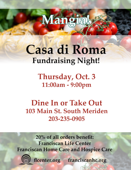 Helping others has never tasted so good! Join us in supporting our Franciscan services and a local South Meriden restaurant. On October 3rd Casa di Roma will donate 20% of its proceeds to the Franciscan Life Center and Franciscan Home Care and Hospice Care. Mangia! Visit Casa di Roma's website. Dine in or take out: [...]
