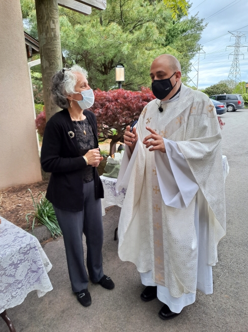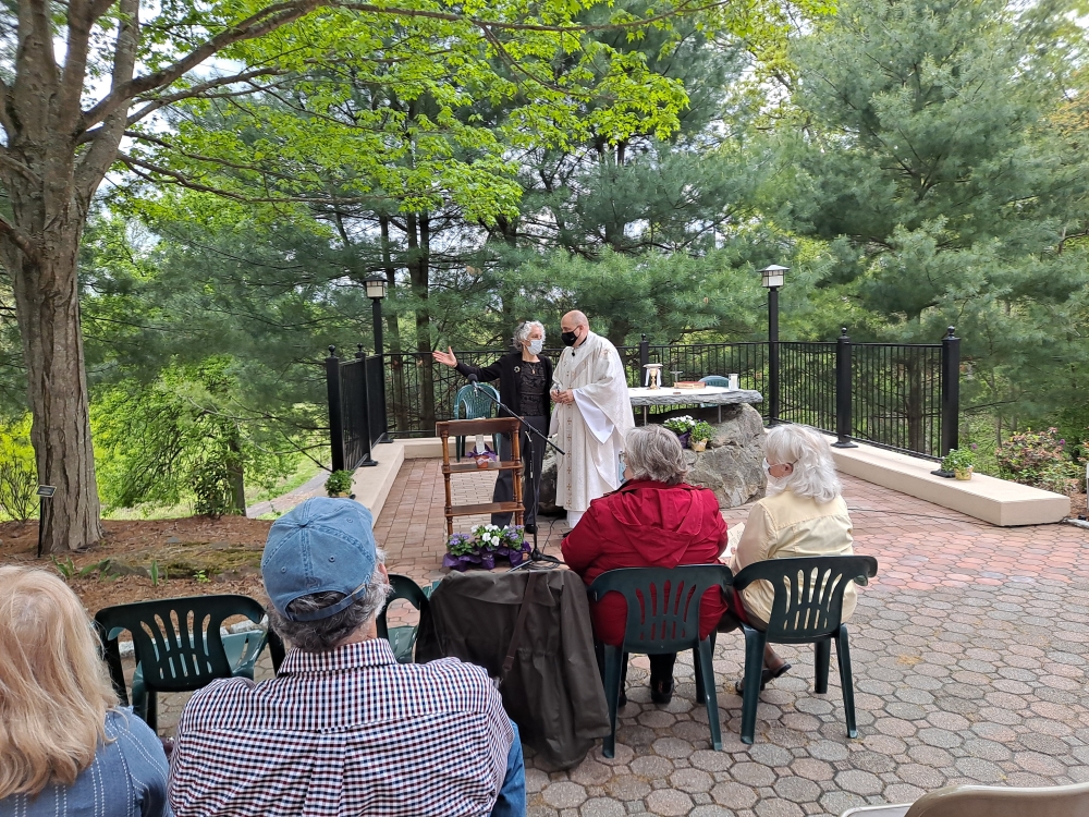 Laura Borrelli, RN, Hospice Director, Franciscan Home Care and Hospice Care, and the Reverend Jeffrey Romans, Pastor, Saint Bridget of Sweden Parish, Cheshire, are sharing a moment prior to the outdoor Mass of Remembrance recently held on the campus of the Franciscan Life Center.