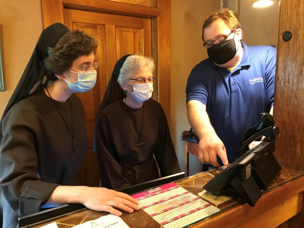 Franciscan Life Center staff members, Sister John Frances LaFever, FSE, Business Manager; Sister Mary Elizabeth Endee, FSE, Director; receive instruction from Eric Brodeur, Phonetel, Inc., on the recently installed telephone system.  The replacement of the old telephone is possible because of a 2019 grant request and the generosity of the John G. Martin Foundation.