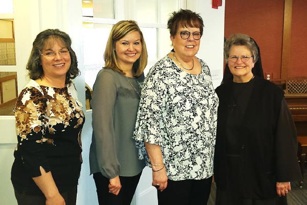 “A component of our mission is to educate individuals and families about health care issues,” said Sister Suzanne Gross, FSE, Administrator, Franciscan Home Care and Hospice Care, far right, at the recently held presentation to over 25 residents of Covenant Village, Cromwell, Connecticut. Sister, along with Kathleen Dietle, Therapy Supervisor, Anna Kurtoglu, RN, Nursing Supervisor, and Marilyn Bell, Chair, Wellness Committee, Covenant Village, have photo taken after presentation.