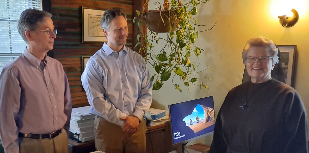 Sister Suzanne Gross, FSE, Administrator, Franciscan Home Care and Hospice Care, meets with James Cantey, (left) President and Owner, TPS Group, and Robert Klobukowski, Vice President, IT, to thank them for the new computer they donated to the agency for her use.